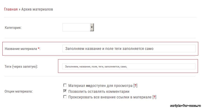 Автоматическое заполнение поля Теги при добавление материала или новости на uCoz