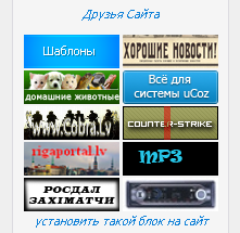 Как же быть без блока баннеров друзей под названием "Наши друзья" для портала uCoz. Конечно многие из Вас подумают да ведь это только реклама, но я Вам скажу больше - такой блок с баннерами друзей сделает Ваш сайт как и красивее так и более популярными, так как раз есть баннеры друзей, значит Ваш сайт сотрудничает с другими и ведёт работу по оптимизации. Всё равно на баннеры мало кто кликает, зато сайт станет более приметнее. Ведь согласитесь, на любом хорошем и популярном сайте есть свой такой блок ;)